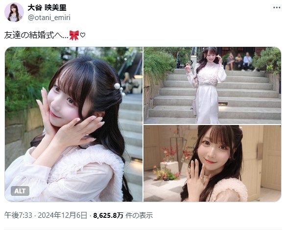 アイドルグループ=LOVEの大谷映美里(26)が10日までにX(旧ツイッター)を更新。友人の結婚式に淡いピンクのドレスを着て出席したことをめぐるネット上の騒動について謝罪した。