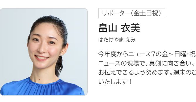 番組公式サイトでは「今年度からニュース7の金~日曜・祝日のリポーターを務めます!みなさんが『知りたい!』と思うニュースの現場で、真剣に向き合い、自身でよく考えながら、リアルな声や情報を温度感とともにお伝えできるよう努めます。週末のひととき、みなさんの声を聞かせてください。よろしくお願いいたします」と意欲をつづっていた。
