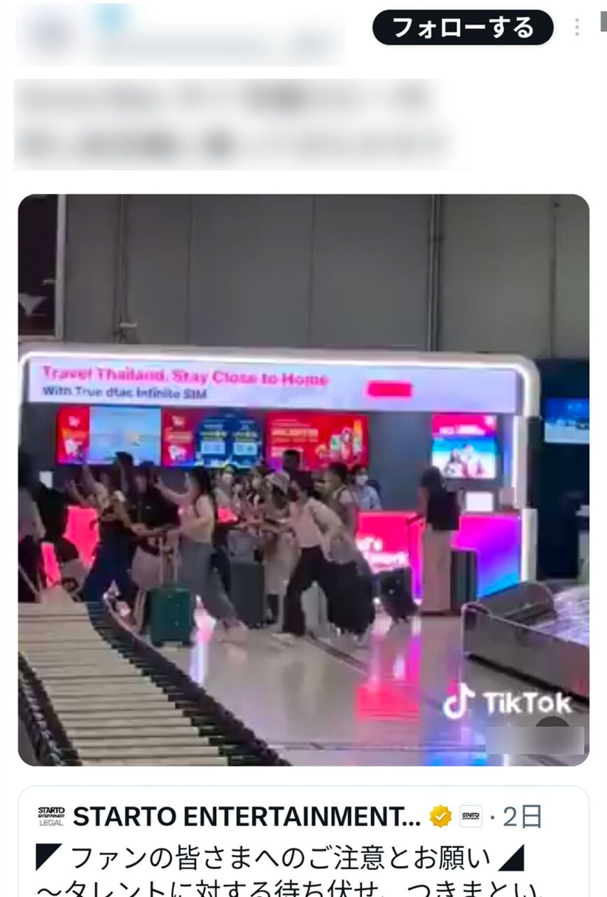 「前日22日に、タイの空港の到着ロビーを移動するメンバーの姿を少し遠くから撮影した動画がXに投稿されました。その動画には、Snow Manファンと思われる女性たちがメンバーのすぐ近くをスマホを向けて取り囲みながら、際限なく追いかけている様子が映し出されていたのです。おそらく、Snow Manと同じ便に狙って搭乗したファンなのだと思います」(芸能記者、以下同)