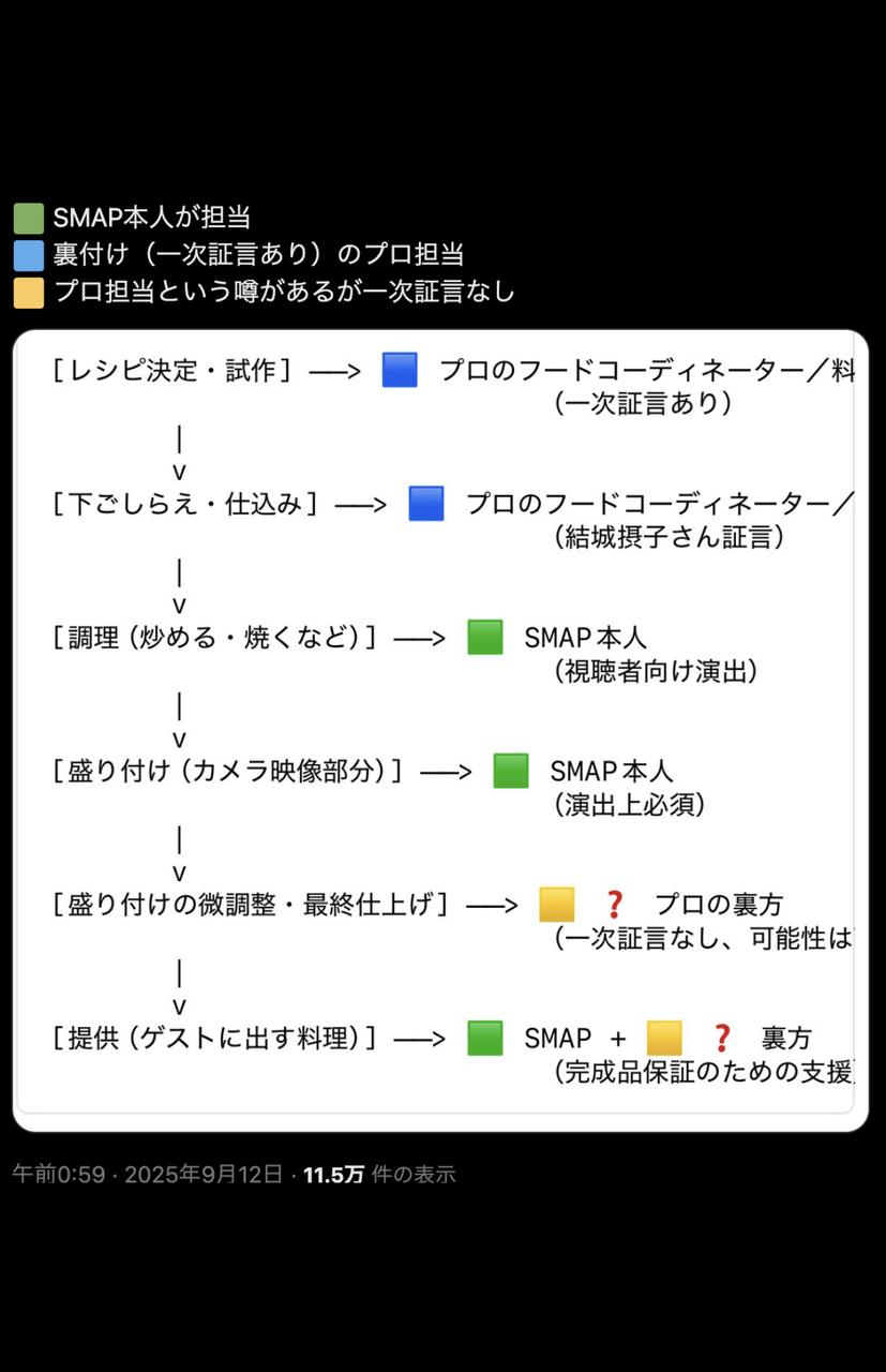 「ビストロの投稿はSMAPの皆さんがすべて料理しているように見える演出についての問題提起が目的でした。関西テレビの方にお伺いした内容を記載しましたが、裏取りを十分に行わなかった点については深くお詫び申し上げます。私自身、長年のSMAPファンとしてとても驚きました。メディアの情報を過信せず、もっと丁寧に調べるべきでした(中略)」と謝罪のコメントを投稿。