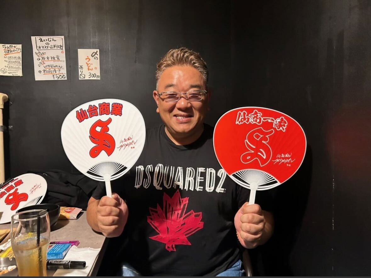 伊達は「先日、我々は仙台商業高校にウチワを5000枚寄付しました!色合いや文言を何度も検討しました。私学の仙台育英のウチワをいつも羨ましく感じていました。だから、作りました」(※以下略、全文は引用元サイトをご覧ください。)