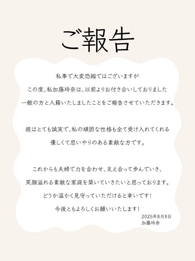 続けて「彼はとても誠実で、私の頑固な性格も全て受け入れてくれる優しくて思いやりのある素敵な方です。これからも夫婦で力を合わせ、支え合って歩んでいき、笑顔溢れる素敵な家庭を築いていきたいと思っております」と記述。最後に「どうか温かく見守っていただけると幸いです! 今後ともよろしくお願いいたします! 2025年8月8日 加藤玲奈」と締めくくった。