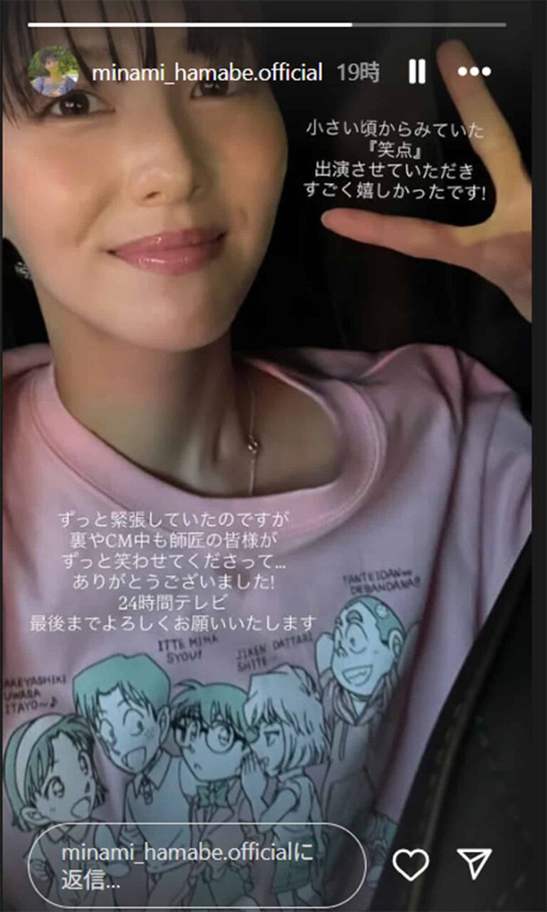 浜辺は放送終了後、Instagramのストーリーを投稿。ピンクのTシャツ姿でピースサインをする写真をアップし