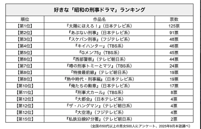 「あなたの好きな昭和の刑事ドラマは?」を、全国の50代以上の男女500人にきいた。対象としたのは代表的な15作品だ。