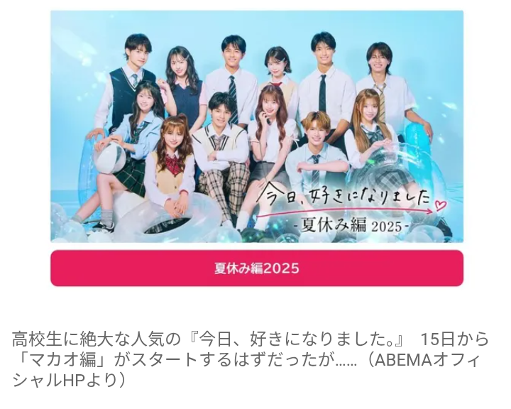 『今日、好きになりました。』が急遽変更…出演高校生の“喫煙&飲酒”疑惑写真流出に「アベマの回答」