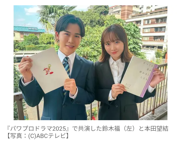 2人は「撮影現場で会うと緊張して目を合わせられなかった」と言いながらも、鈴木は本田が出演予定のABCの連続ドラマ『すべての恋が終わるとしても』(10月12日午後10時15分スタート)の予告映像を見て、「(本田の共演者の)なにわ男子・藤原丈一郎くんもよく知っているので、2人の関係が楽しみです」と話した。