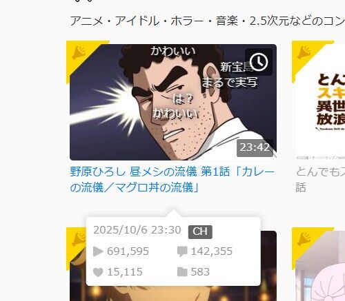 国内最大級の動画プラットフォームのニコニコでは、2025年10月から始まる新作アニメを計57作品配信している。10月中旬に入り、一通りの初回エピソードが無料配信されているなかで、特に『野原ひろし 昼メシの流儀』が群を抜いて再生数を伸ばしている。