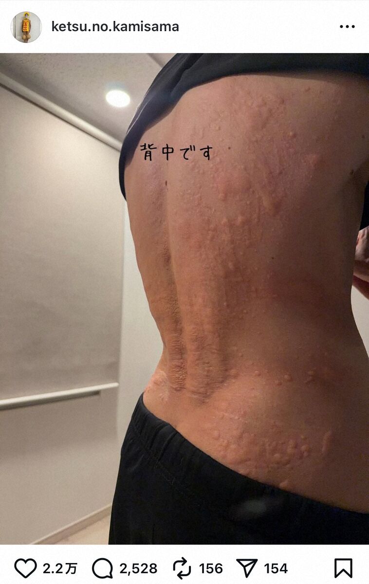 樽美酒は「これ酷い時の蕁麻疹です いつどのタイミングで出るのかわかりません、、これじゃあ服は*ないなと思ってます笑」とつづり、背中一面に症状が出た写真を投稿。「とりあえず迷惑かける前にお伝えしておきます 気持ちが悪いとかなく、ただ痒くて眠れないみたいな感じです。運動は問題なくできてます」とするも、ファンからは心配の声が殺到。
