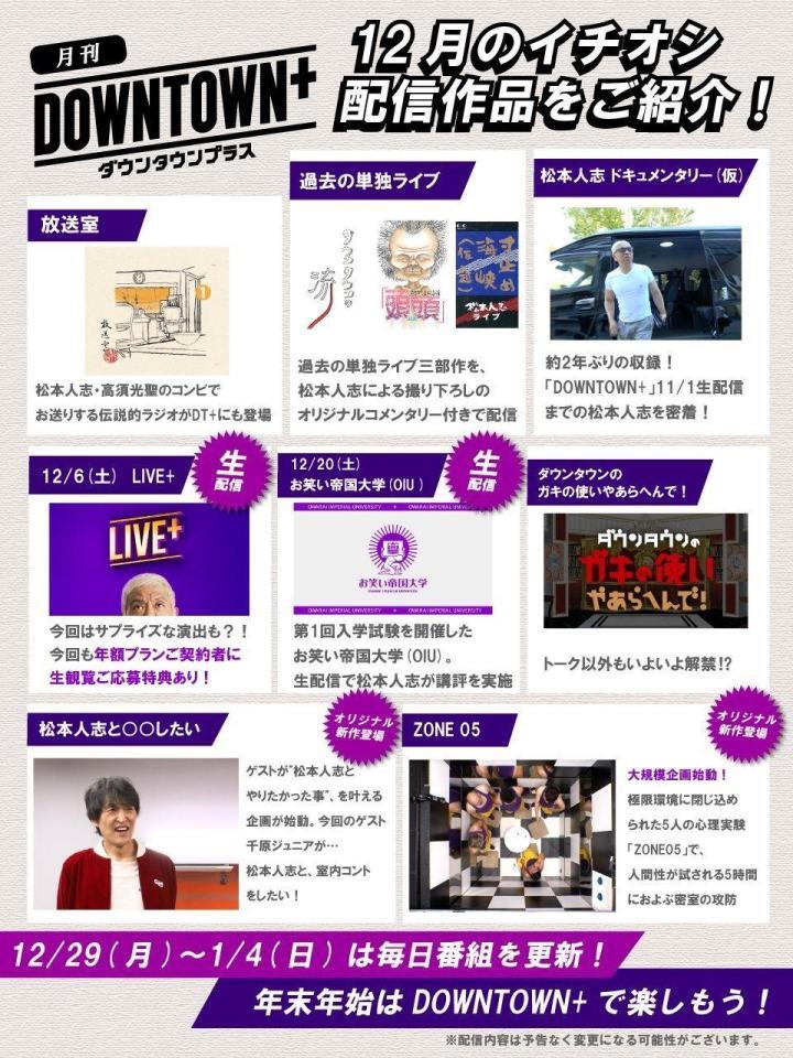 お笑いコンビ・ダウンタウンの独自配信サービス「DOWNTOWN+(ダウンタウンプラス)」の12月の配信作品一覧が27日、公式Xで発表された。