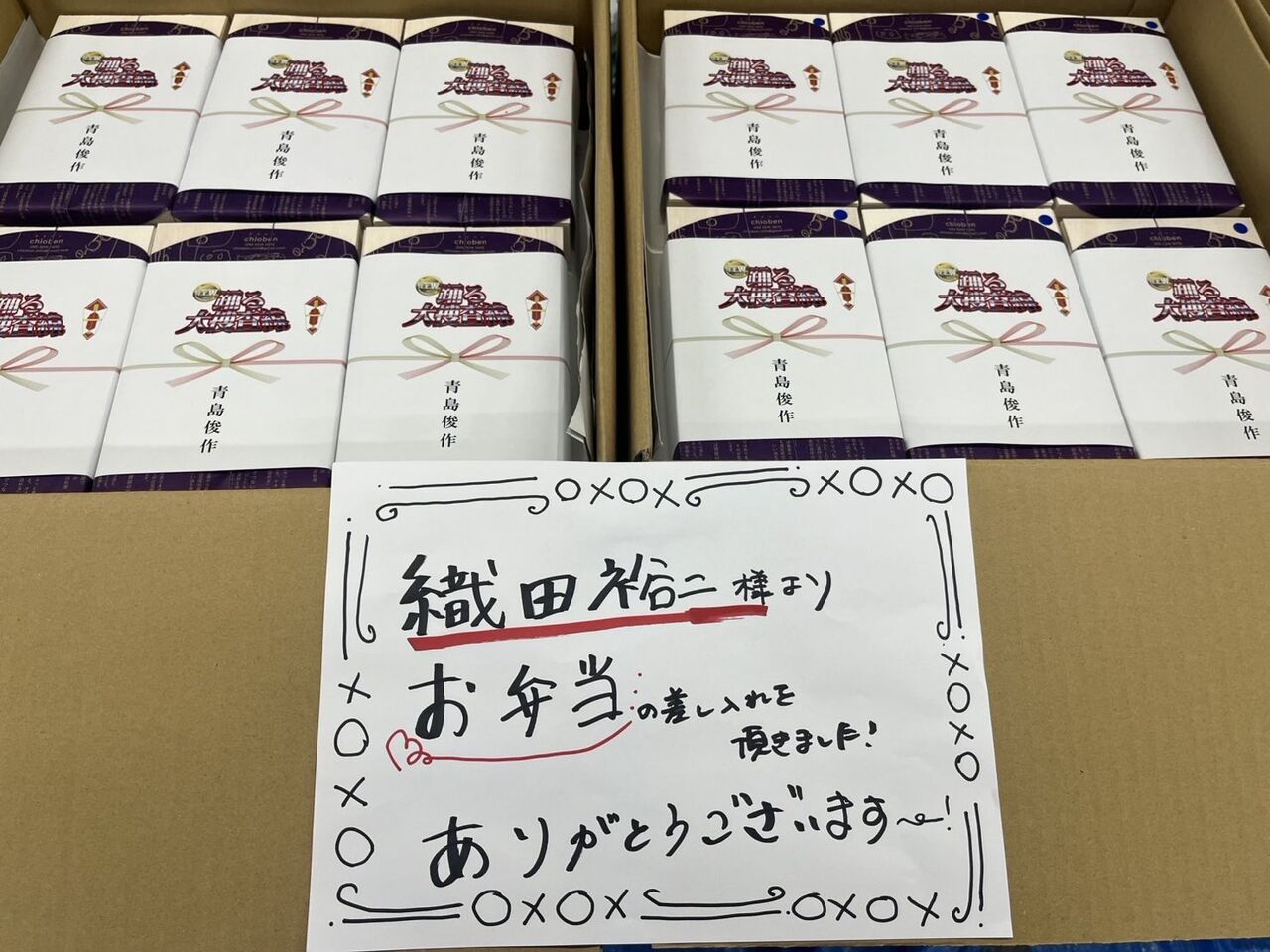「記念すべき今日の現場には“青島俊作 差し入れ弁当”が!!織田さん、ありがとうございます」「そして、おめでとうございます」と感謝を伝えた。