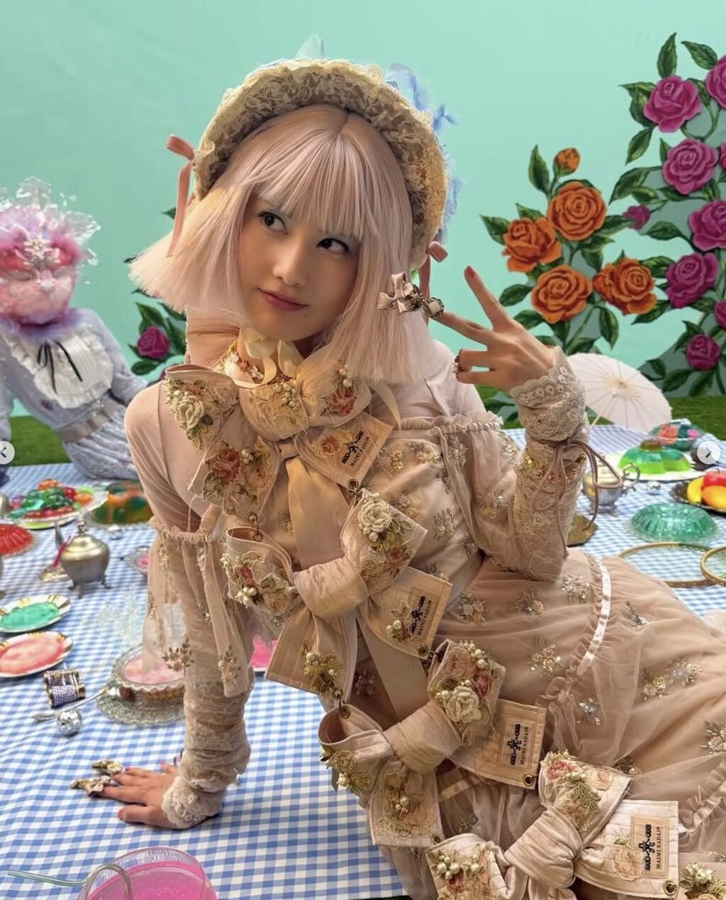ピンクブロンドのボブヘアスタイルを見せる橋本さんは、フリルやリボンのついた同系色のドレスを着用。華やかなヘッドドレスや傘の小物を用いたちょっぴりクラシカルな装いで、橋本さんの柔らかくも凛とした表情が目をひく一枚です。