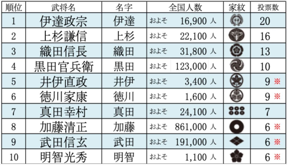 そして、1位は、伊達政宗で、20票獲得しました。回答では、「かっこいいから」「地元出身の強い人」などの声があり、「かっこいい」の理由には、生き様・強さ・ 異名の「独眼竜」という声が多く寄せられたということです。