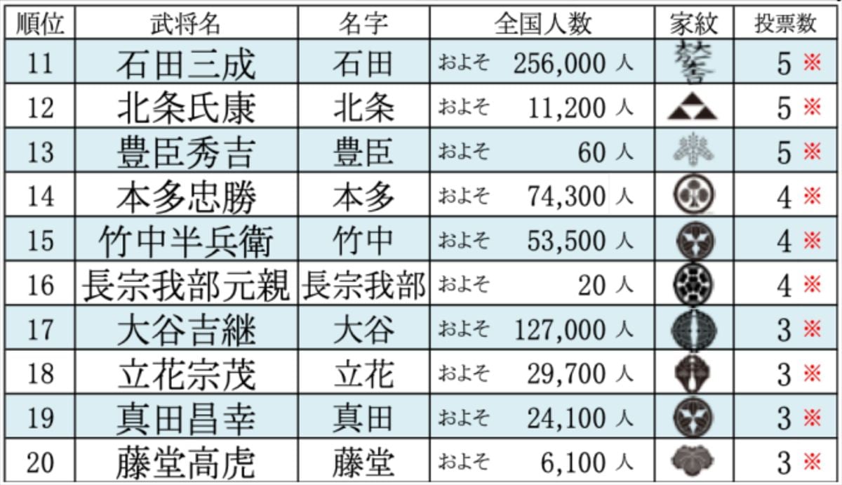 3位は、織田信長で、13票でした。信長は、多くの家臣を引きつけた魅力や、キリスト教の容認、革新的な技術を取り入れるなどしたといわれており、回答者から「カリスマ性」「柔軟性」「革命児」についての理由が多く見られたとのことです。