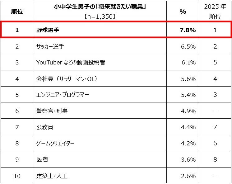 2位以下は「サッカー選手」(6.5%)、「YouTuberなどの動画投稿者」(6.1%)、「会社員」(5.6%)、「エンジニア・プログラマー」(5.4%)が続いた。
