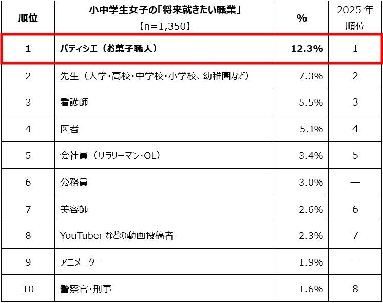 一方、小中学生女子の将来就きたい職業のトップは、7年連続で「パティシエ」(12.3%)。就きたい理由としては「お菓子・ケーキ(作り)が好きだから」「楽しそう・面白そうだから」「料理が好きだから」といった声があった。