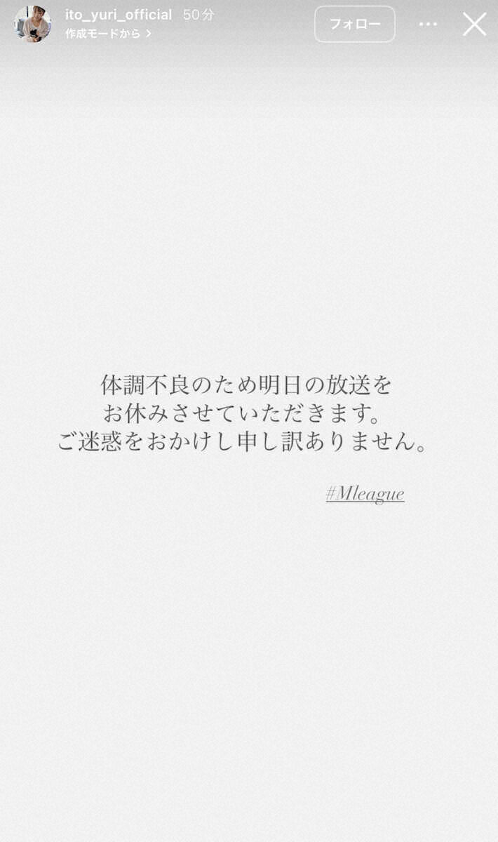 フリーアナウンサーの伊藤友里さんが、自身のインスタグラムを更新、本日出演予定だったMリーグ公式レポーターを体調不良で欠席することを報告しました。